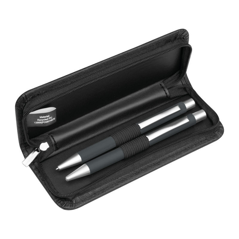 Az Uppsala írószett a professzionális íróeszközök tökéletes kombinációja, amely elegáns fekete dizájnnal és ezüst részletekkel teszi teljessé íróasztali kiegészítőid kollekcióját. A prémium minőségű METAL, RUBBER és LEATHERETTE anyagokból készült szett golyóstollat és mechanikus ceruzát tartalmaz, kék tintával, amely garantálja a folyamatos és precíz írásélményt. A kompakt 16,5 x 5,8 x 2,5 cm-es méretű, stílusos PU tok védelmet és könnyű hordozhatóságot biztosít, így akár irodában, akár üzleti tárgyalásokon mindig professzionálisan jelenhetsz meg. A gondosan megtervezett írószett nem csupán funkcionális eszköz, hanem igazi státuszszimbólum is, amely kiemeli egyéniségedet és üzleti érzékenységedet. Fedezd fel a kifinomult írás örömét az Uppsala írószettel, amely tökéletes ajándék üzleti partnereknek, kollégáknak vagy saját magadnak.